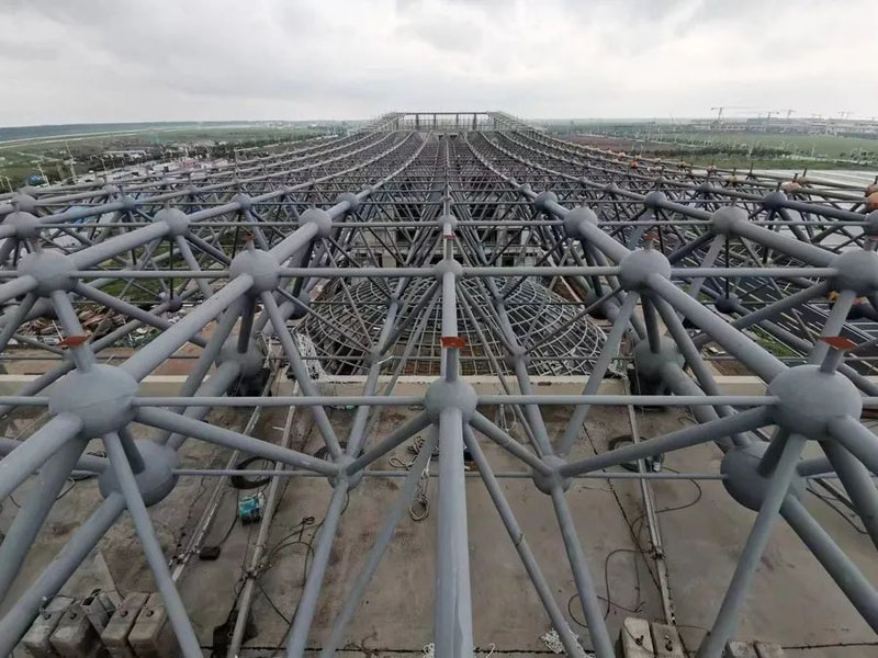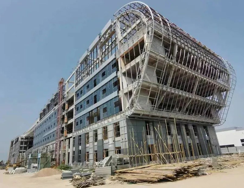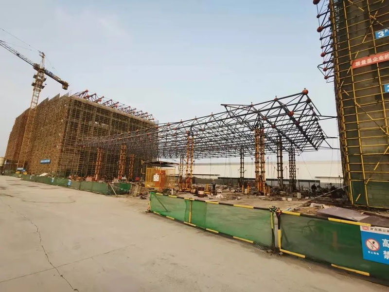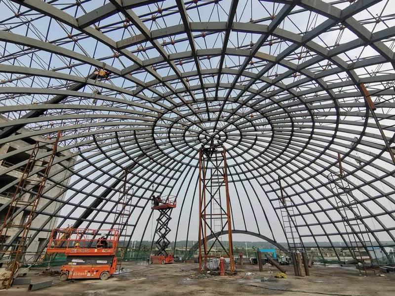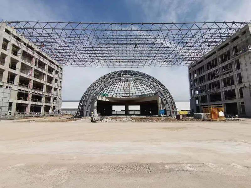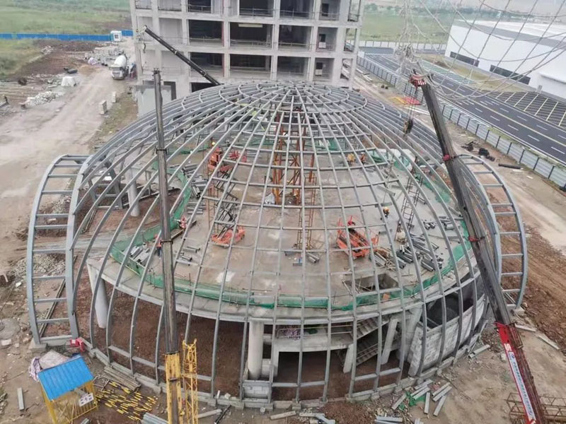 吉利飛行汽車項(xiàng)目汽車展廳鋼結(jié)構(gòu)工程,主體是直徑32米的橢圓形空間桁架結(jié)構(gòu),本工程加工工藝復(fù)雜,構(gòu)件數(shù)量多且雜,車間及現(xiàn)場焊接工作大,主構(gòu)件對接焊接均要求一級焊縫,施工期間兩臺全站儀同時(shí)不同角度測量,配合臨時(shí)支撐架現(xiàn)場有序、施工,整體工期45天。