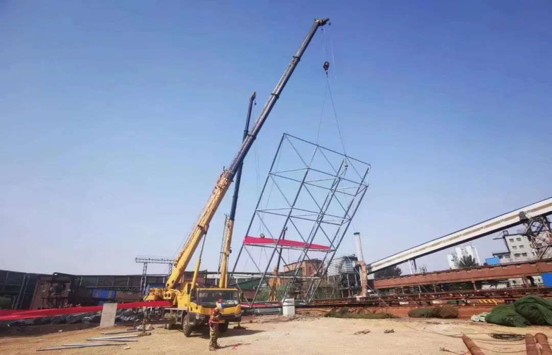 老區(qū)一次料場(chǎng)封閉料棚網(wǎng)架長(zhǎng)度363米、寬度106米、高度42米,展開(kāi)面積70000平方米。6月23日驕陽(yáng)似火炎炎的夏日,揮汗如雨,料棚起步架順利吊裝對(duì)接完成,掀起了大干熱潮。